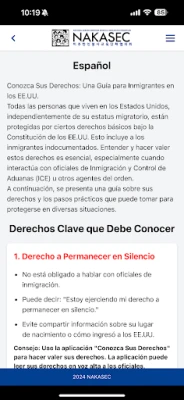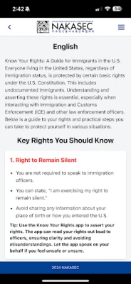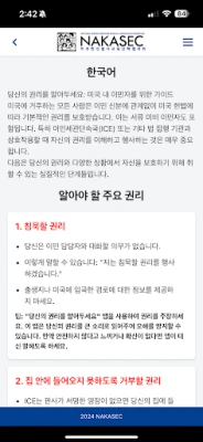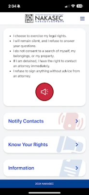 The Know Your Rights 4 Immigrants app is prepared for the general information of interested persons. NAKAEC is not a government entity, and the Know Your Rights 4 Immigrants app is neither created by nor a representative of a government entity. The research is intended as a guide, should not be regarded as legal advice, and information contained in this application is subject to change, for which NAKASEC is not responsible.